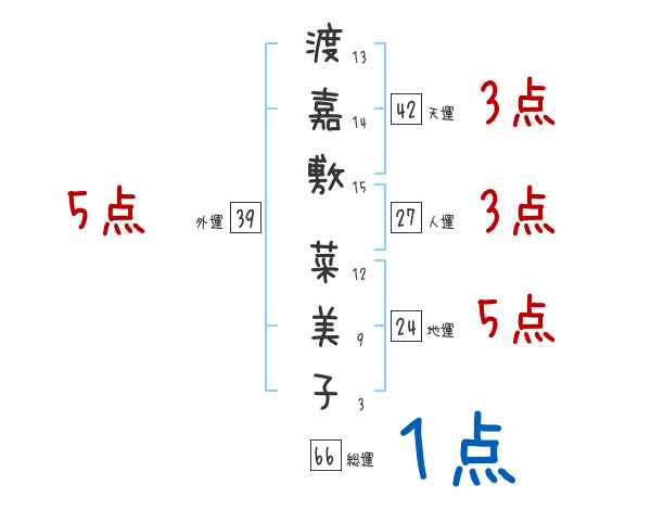 外運![]() | 渡嘉敷菜美子さんの外運は39画の5つ星!社交性に優れ人望が厚い。人の上に立ち成功する。 生活面を象徴する運勢です。外部から受ける影響力を表し、結婚運、家庭運や職場、環境への順応性を表します。 |