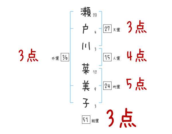 総運![]() | 瀬戸川菜美子さんの総運は51画の3つ星!変化が激しく、危険に注意。堅実な性格。 あなたの人生を表す1番重要な運勢です。生涯を通じて影響する総合運となり、主に50歳以降の晩年期に影響を及ぼします。 |