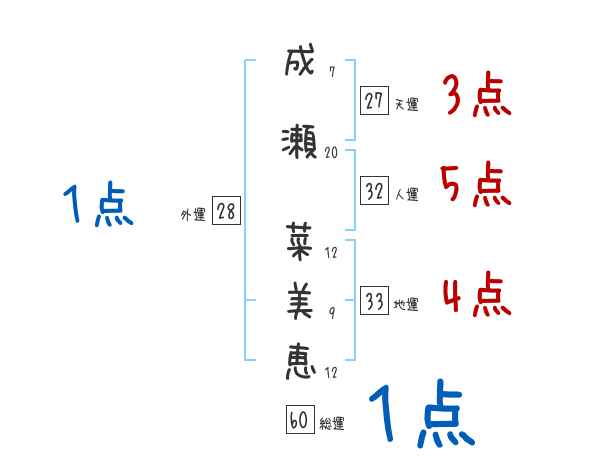 人運![]() | 成瀬菜美恵さんの人運は32画の5つ星!柔軟性があり成功する。チャンスが多く金運が良い。 性格や才能などを表す2番目に重要な運勢です。人間関係や協調性、社会的な成功に影響します。主に20歳から50歳ぐらいまでの中年期の運勢を表します。 |
