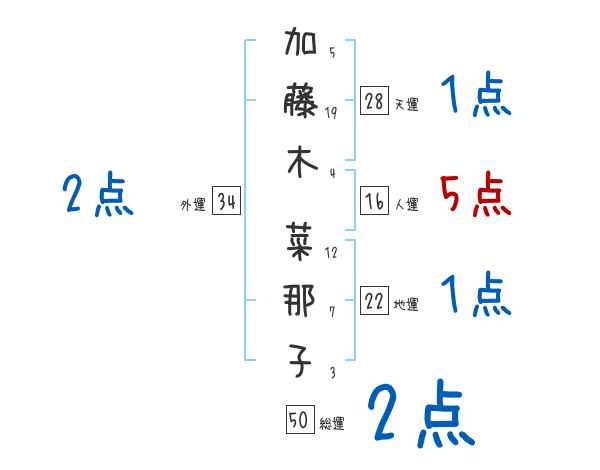 天運![]() | 加藤木菜那子さんの天運は28画の1つ星!家庭環境に注意。スポーツで活躍できる能力があるかも。 家系が持つ宿命的な運勢を表します。祖先から受け継いだ苗字ですので自分の力が及びません。家柄を象徴します。 |