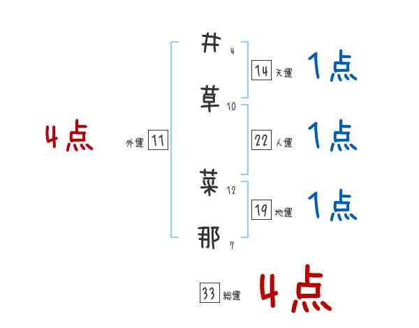 人運![]() | 井草菜那さんの人運は22画の1つ星!努力することが苦手ないっぽう手先が器用。芸術性にも優れる。 性格や才能などを表す2番目に重要な運勢です。人間関係や協調性、社会的な成功に影響します。主に20歳から50歳ぐらいまでの中年期の運勢を表します。 |