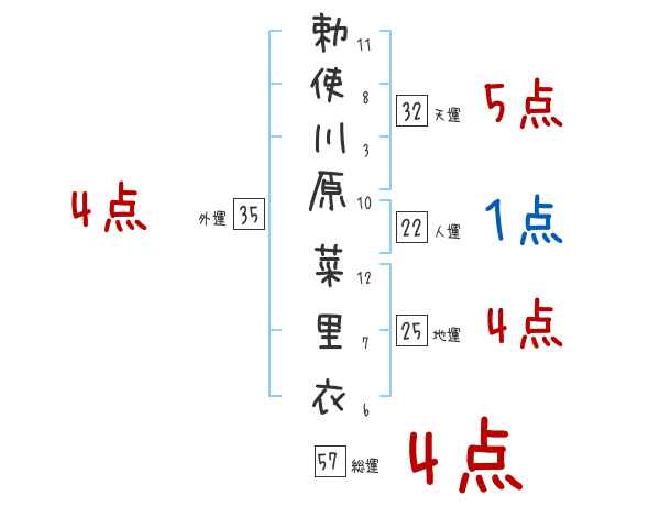 総運![]() | 勅使川原菜里衣さんの総運は57画の4つ星!向上心があり人望がある。地位を得る。 あなたの人生を表す1番重要な運勢です。生涯を通じて影響する総合運となり、主に50歳以降の晩年期に影響を及ぼします。 |
