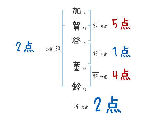 天運![]() | 加賀谷菫鈴さんの天運は24画の5つ星!家庭運が良く順調な人生。金運にも恵まれる。 家系が持つ宿命的な運勢を表します。祖先から受け継いだ苗字ですので自分の力が及びません。家柄を象徴します。 |