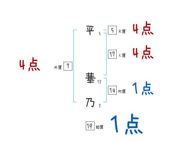 天運![]() | 平華乃さんの天運は5画の4つ星!健康で安泰。協調性に優れ、財産に恵まれる。 家系が持つ宿命的な運勢を表します。祖先から受け継いだ苗字ですので自分の力が及びません。家柄を象徴します。 |