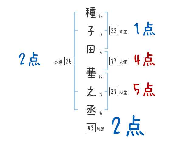 総運![]() | 種子田華之丞さんの総運は43画の2つ星!頑固な性格で独立心が強いかも。やや非現実的で浪費に注意しましょう。 あなたの人生を表す1番重要な運勢です。生涯を通じて影響する総合運となり、主に50歳以降の晩年期に影響を及ぼします。 |