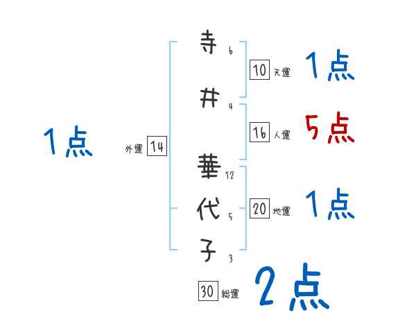 人運![]() | 寺井華代子さんの人運は16画の5つ星!人望が厚く大きく発展する。逆転成功が見える。 性格や才能などを表す2番目に重要な運勢です。人間関係や協調性、社会的な成功に影響します。主に20歳から50歳ぐらいまでの中年期の運勢を表します。 |