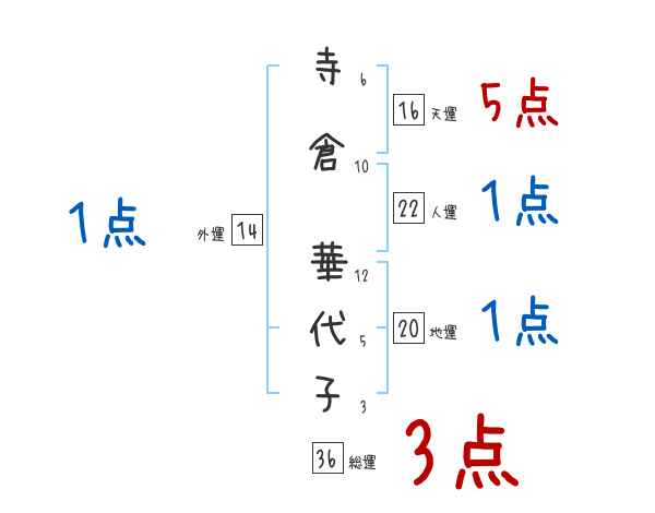 総運![]() | 寺倉華代子さんの総運は36画の3つ星!先見性が豊かです。多少神経質で苦労することも。 あなたの人生を表す1番重要な運勢です。生涯を通じて影響する総合運となり、主に50歳以降の晩年期に影響を及ぼします。 |