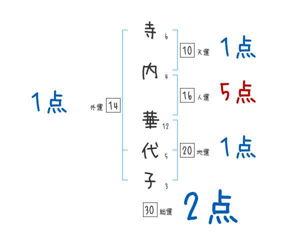 人運![]() | 寺内華代子さんの人運は16画の5つ星!人望が厚く大きく発展する。逆転成功が見える。 性格や才能などを表す2番目に重要な運勢です。人間関係や協調性、社会的な成功に影響します。主に20歳から50歳ぐらいまでの中年期の運勢を表します。 |