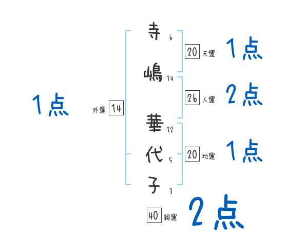 外運![]() | 寺嶋華代子さんの外運は14画の1つ星!人に対して優しいがストレスを溜め込みがち。人間関係のトラブルを避けるよう気をつけましょう。 生活面を象徴する運勢です。外部から受ける影響力を表し、結婚運、家庭運や職場、環境への順応性を表します。 |