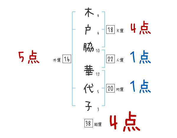 外運![]() | 木戸脇華代子さんの外運は16画の5つ星!人望が厚く大きく発展する。逆転成功が見える。 生活面を象徴する運勢です。外部から受ける影響力を表し、結婚運、家庭運や職場、環境への順応性を表します。 |