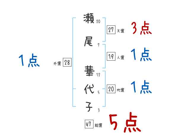 外運![]() | 瀬尾華代子さんの外運は28画の1つ星!家庭環境に注意。スポーツで活躍できる能力があるかも。 生活面を象徴する運勢です。外部から受ける影響力を表し、結婚運、家庭運や職場、環境への順応性を表します。 |