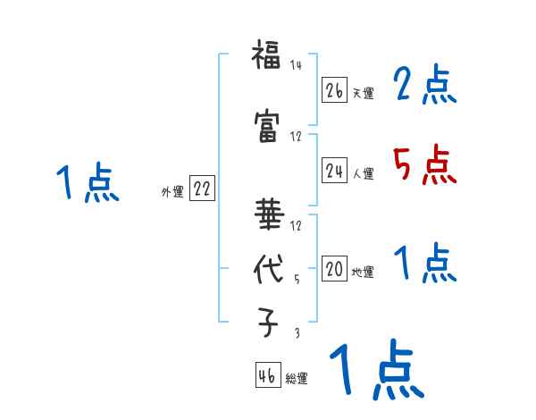 外運![]() | 福富華代子さんの外運は22画の1つ星!努力することが苦手ないっぽう手先が器用。芸術性にも優れる。 生活面を象徴する運勢です。外部から受ける影響力を表し、結婚運、家庭運や職場、環境への順応性を表します。 |