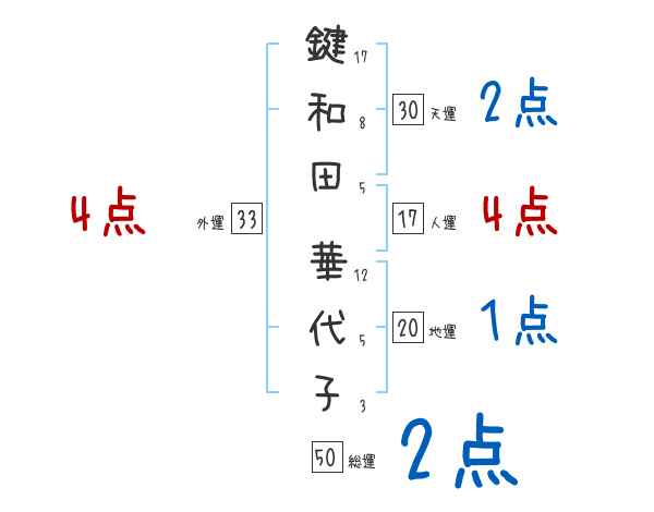 天運![]() | 鍵和田華代子さんの天運は30画の2つ星!浮き沈みの激しさに注意しましょう。 家系が持つ宿命的な運勢を表します。祖先から受け継いだ苗字ですので自分の力が及びません。家柄を象徴します。 |
