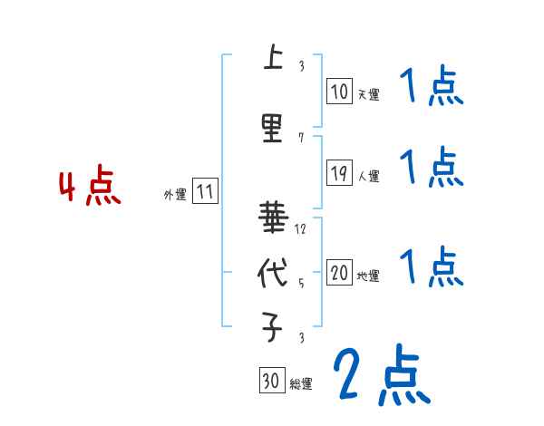 | 天運  | 上里華代子さんの天運は10画の1つ星!不安を感じやすい傾向。ストレスを抱えないように注意しましょう。家系が持つ宿命的な運勢を表します。祖先から受け継いだ苗字ですので自分の力が及びません。家柄を象徴します。 |