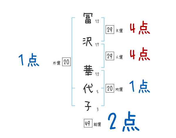 天運![]() | 冨沢華代子さんの天運は29画の4つ星!完全主義で才能がある。厳格な心の持ち主。 家系が持つ宿命的な運勢を表します。祖先から受け継いだ苗字ですので自分の力が及びません。家柄を象徴します。 |