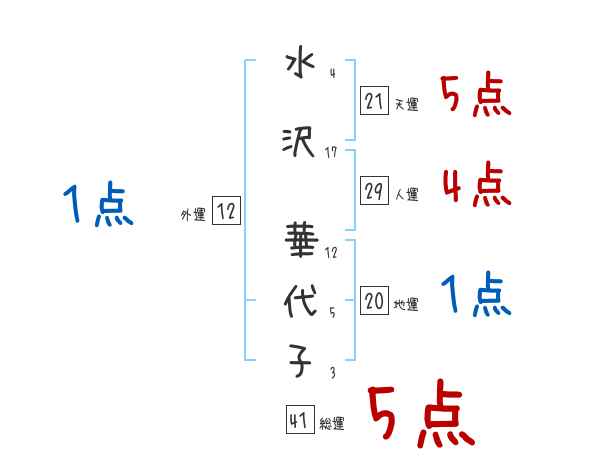 天運![]() | 水沢華代子さんの天運は21画の5つ星!統率力がある。独立し成功する。名誉を手に入れる。 家系が持つ宿命的な運勢を表します。祖先から受け継いだ苗字ですので自分の力が及びません。家柄を象徴します。 |