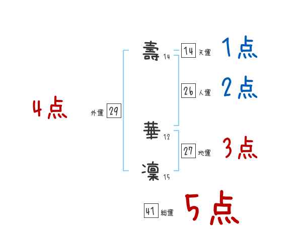 外運![]() | 壽華凜さんの外運は29画の4つ星!完全主義で才能がある。厳格な心の持ち主。 生活面を象徴する運勢です。外部から受ける影響力を表し、結婚運、家庭運や職場、環境への順応性を表します。 |