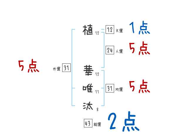総運![]() | 植華唯汰さんの総運は43画の2つ星!頑固な性格で独立心が強いかも。やや非現実的で浪費に注意しましょう。 あなたの人生を表す1番重要な運勢です。生涯を通じて影響する総合運となり、主に50歳以降の晩年期に影響を及ぼします。 |