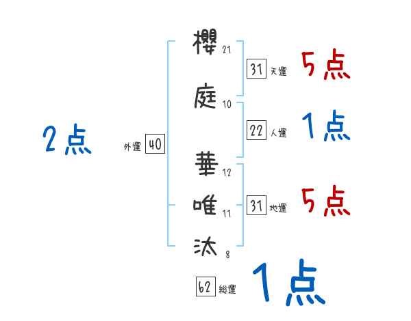 天運![]() | 櫻庭華唯汰さんの天運は31画の5つ星!社交性があり判断力に優れる。順風満帆な人生で円満な生活。 家系が持つ宿命的な運勢を表します。祖先から受け継いだ苗字ですので自分の力が及びません。家柄を象徴します。 |