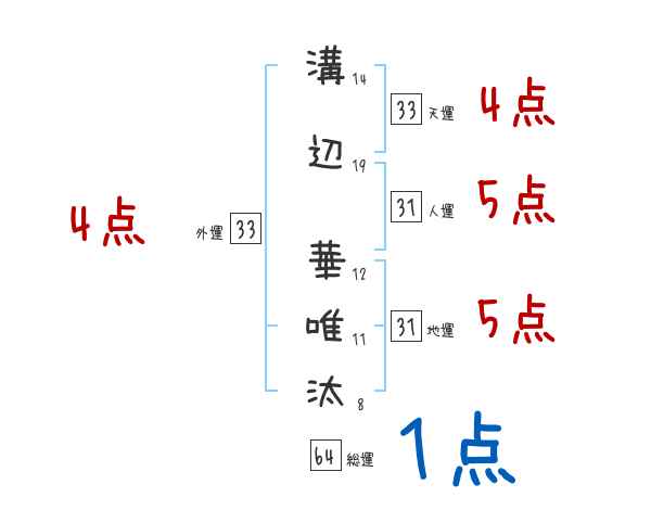 外運![]() | 溝辺華唯汰さんの外運は33画の4つ星!権力志向でプライドが高い。勇気があり運を切り開き成功する。 生活面を象徴する運勢です。外部から受ける影響力を表し、結婚運、家庭運や職場、環境への順応性を表します。 |