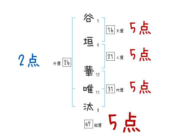 総運![]() | 谷垣華唯汰さんの総運は47画の5つ星!実力が開花し発展する円満な人生。財に恵まれる。 あなたの人生を表す1番重要な運勢です。生涯を通じて影響する総合運となり、主に50歳以降の晩年期に影響を及ぼします。 |