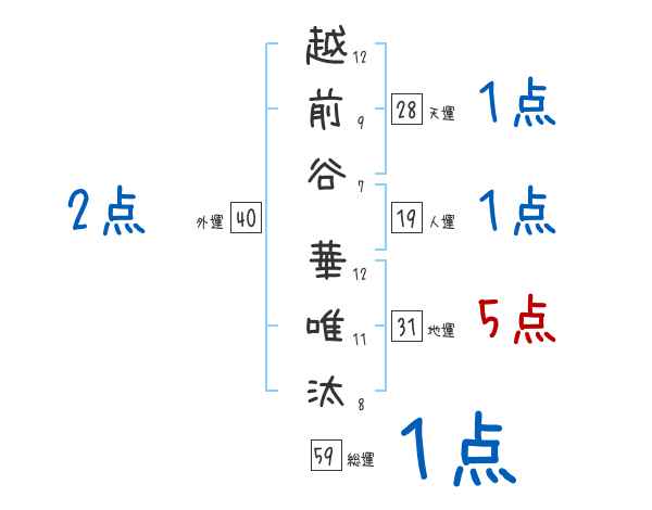 天運![]() | 越前谷華唯汰さんの天運は28画の1つ星!家庭環境に注意。スポーツで活躍できる能力があるかも。 家系が持つ宿命的な運勢を表します。祖先から受け継いだ苗字ですので自分の力が及びません。家柄を象徴します。 |