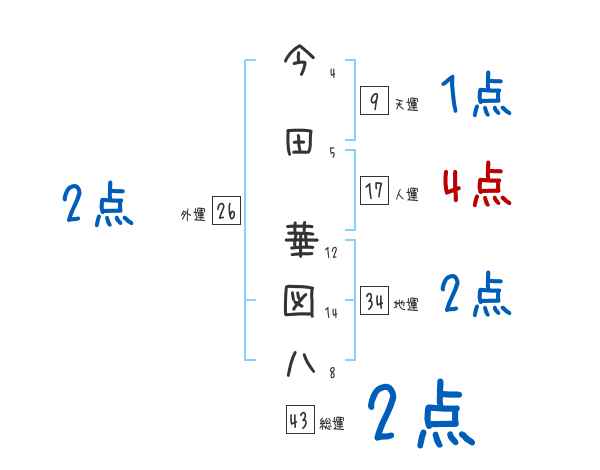 外運![]() | 今田華図八さんの外運は26画の2つ星!波瀾万丈かも。信頼できる人を大事にしましょう。 生活面を象徴する運勢です。外部から受ける影響力を表し、結婚運、家庭運や職場、環境への順応性を表します。 |