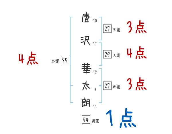 人運![]() | 唐沢華太朗さんの人運は29画の4つ星!完全主義で才能がある。厳格な心の持ち主。 性格や才能などを表す2番目に重要な運勢です。人間関係や協調性、社会的な成功に影響します。主に20歳から50歳ぐらいまでの中年期の運勢を表します。 |