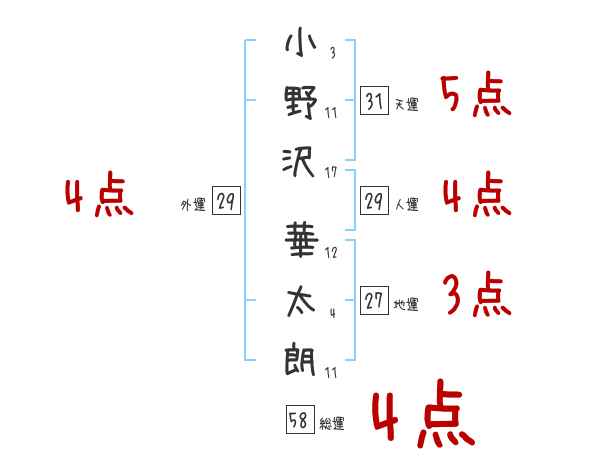 外運![]() | 小野沢華太朗さんの外運は29画の4つ星!完全主義で才能がある。厳格な心の持ち主。 生活面を象徴する運勢です。外部から受ける影響力を表し、結婚運、家庭運や職場、環境への順応性を表します。 |