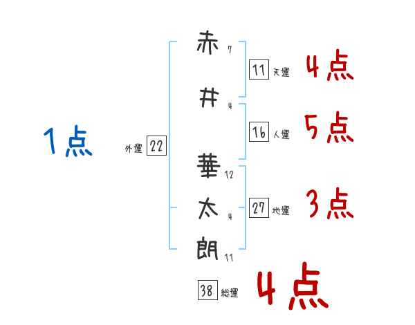 天運![]() | 赤井華太朗さんの天運は11画の4つ星!着実に富や地位を得る幸運な人生。 家系が持つ宿命的な運勢を表します。祖先から受け継いだ苗字ですので自分の力が及びません。家柄を象徴します。 |