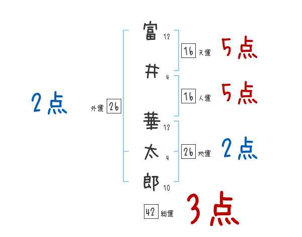 人運![]() | 富井華太郎さんの人運は16画の5つ星!人望が厚く大きく発展する。逆転成功が見える。 性格や才能などを表す2番目に重要な運勢です。人間関係や協調性、社会的な成功に影響します。主に20歳から50歳ぐらいまでの中年期の運勢を表します。 |