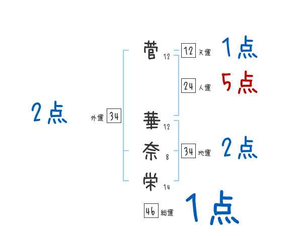 天運![]() | 菅華奈栄さんの天運は12画の1つ星!簡単な失敗で諦めてしまいやすいかも。着実に行動すると良いでしょう。 家系が持つ宿命的な運勢を表します。祖先から受け継いだ苗字ですので自分の力が及びません。家柄を象徴します。 |