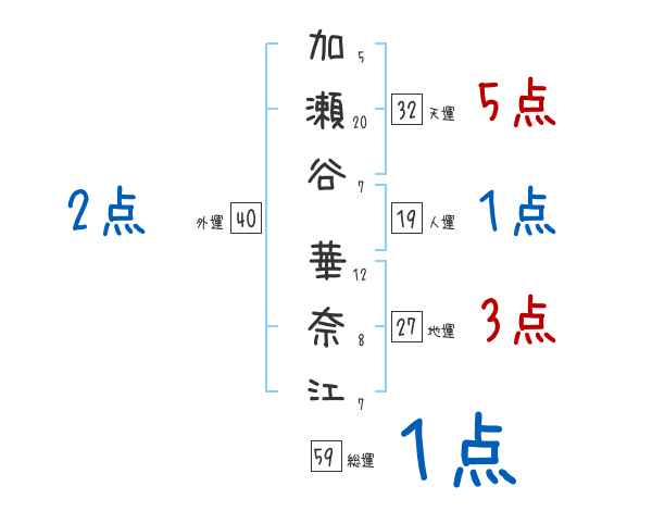 天運![]() | 加瀬谷華奈江さんの天運は32画の5つ星!柔軟性があり成功する。チャンスが多く金運が良い。 家系が持つ宿命的な運勢を表します。祖先から受け継いだ苗字ですので自分の力が及びません。家柄を象徴します。 |