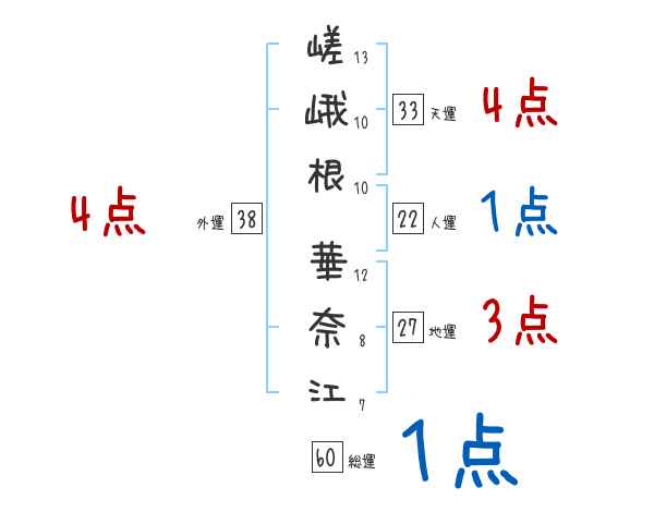 天運![]() | 嵯峨根華奈江さんの天運は33画の4つ星!権力志向でプライドが高い。勇気があり運を切り開き成功する。 家系が持つ宿命的な運勢を表します。祖先から受け継いだ苗字ですので自分の力が及びません。家柄を象徴します。 |