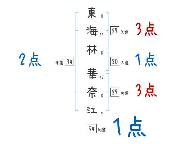 総運![]() | 東海林華奈江さんの総運は54画の1つ星!トラブルが多いかも。周りをよく見て協調して過ごしましょう。 あなたの人生を表す1番重要な運勢です。生涯を通じて影響する総合運となり、主に50歳以降の晩年期に影響を及ぼします。 |