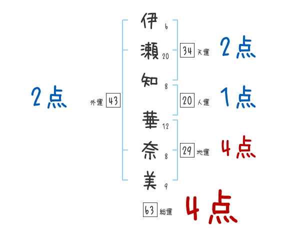 総運![]() | 伊瀬知華奈美さんの総運は63画の4つ星!家庭運がよく順調な生活。温和な性格。 あなたの人生を表す1番重要な運勢です。生涯を通じて影響する総合運となり、主に50歳以降の晩年期に影響を及ぼします。 |