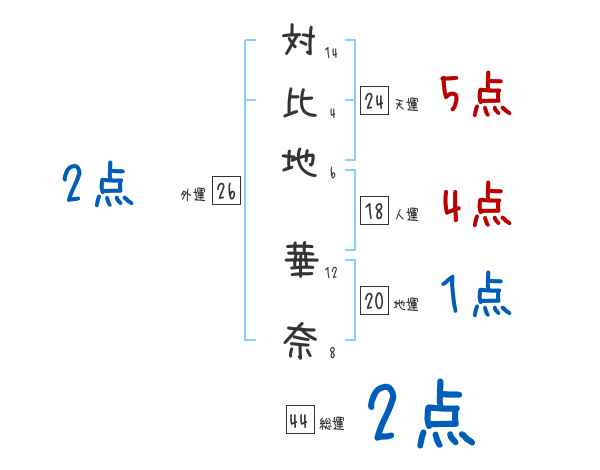 天運![]() | 対比地華奈さんの天運は24画の5つ星!家庭運が良く順調な人生。金運にも恵まれる。 家系が持つ宿命的な運勢を表します。祖先から受け継いだ苗字ですので自分の力が及びません。家柄を象徴します。 |