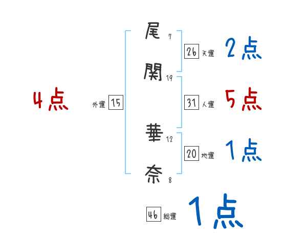 天運![]() | 尾関華奈さんの天運は26画の2つ星!波瀾万丈かも。信頼できる人を大事にしましょう。 家系が持つ宿命的な運勢を表します。祖先から受け継いだ苗字ですので自分の力が及びません。家柄を象徴します。 |