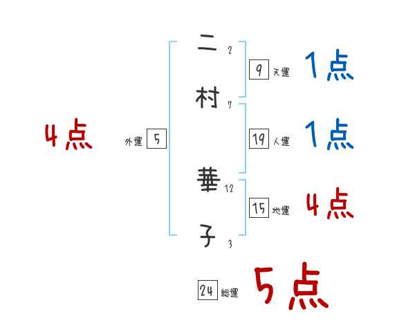 外運![]() | 二村華子さんの外運は5画の4つ星!健康で安泰。協調性に優れ、財産に恵まれる。 生活面を象徴する運勢です。外部から受ける影響力を表し、結婚運、家庭運や職場、環境への順応性を表します。 |