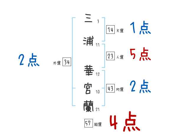 人運![]() | 三浦華宮蘭さんの人運は23画の5つ星!想像力に優れ活力がある。一代で成功し名誉を手に入れる。 性格や才能などを表す2番目に重要な運勢です。人間関係や協調性、社会的な成功に影響します。主に20歳から50歳ぐらいまでの中年期の運勢を表します。 |