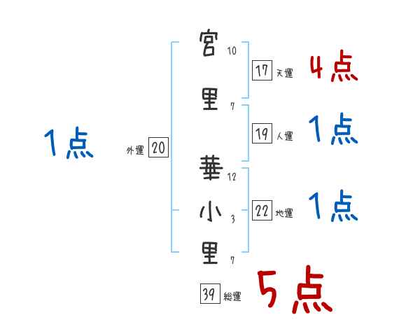 総運![]() | 宮里華小里さんの総運は39画の5つ星!社交性に優れ人望が厚い。人の上に立ち成功する。 あなたの人生を表す1番重要な運勢です。生涯を通じて影響する総合運となり、主に50歳以降の晩年期に影響を及ぼします。 |