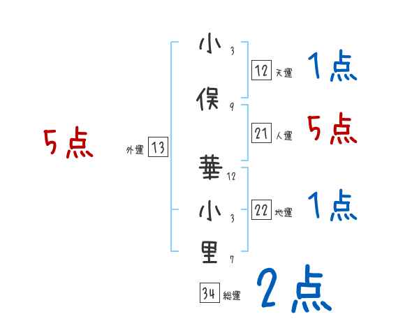 | 外運  | 小俣華小里さんの外運は13画の5つ星!才能に恵まれ人気がある。名声を手に入れる。円満な人生。生活面を象徴する運勢です。外部から受ける影響力を表し、結婚運、家庭運や職場、環境への順応性を表します。 |