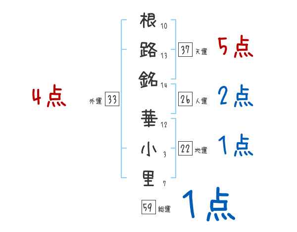 外運![]() | 根路銘華小里さんの外運は33画の4つ星!権力志向でプライドが高い。勇気があり運を切り開き成功する。 生活面を象徴する運勢です。外部から受ける影響力を表し、結婚運、家庭運や職場、環境への順応性を表します。 |