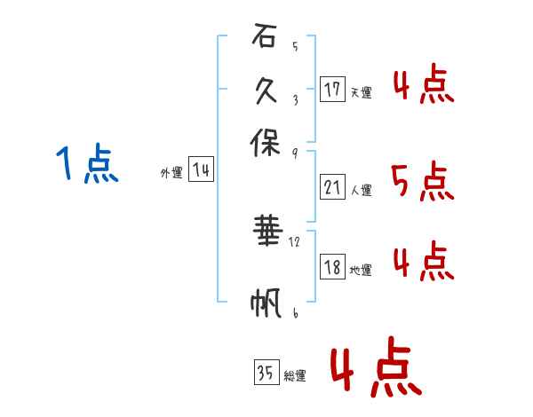 外運![]() | 石久保華帆さんの外運は14画の1つ星!人に対して優しいがストレスを溜め込みがち。人間関係のトラブルを避けるよう気をつけましょう。 生活面を象徴する運勢です。外部から受ける影響力を表し、結婚運、家庭運や職場、環境への順応性を表します。 |