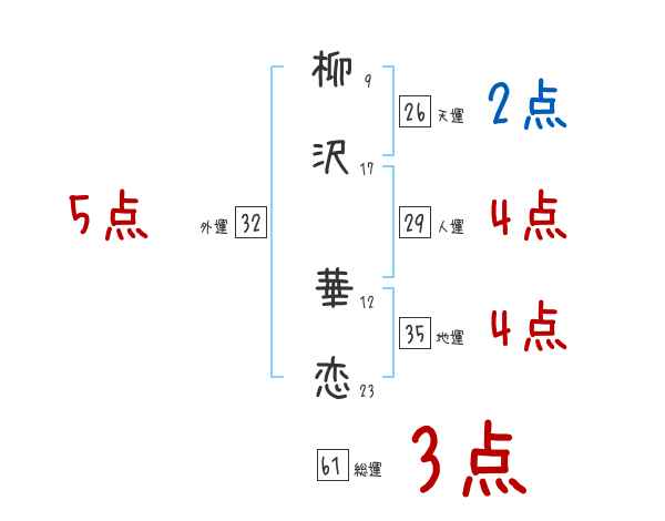 外運![]() | 柳沢華恋さんの外運は32画の5つ星!柔軟性があり成功する。チャンスが多く金運が良い。 生活面を象徴する運勢です。外部から受ける影響力を表し、結婚運、家庭運や職場、環境への順応性を表します。 |