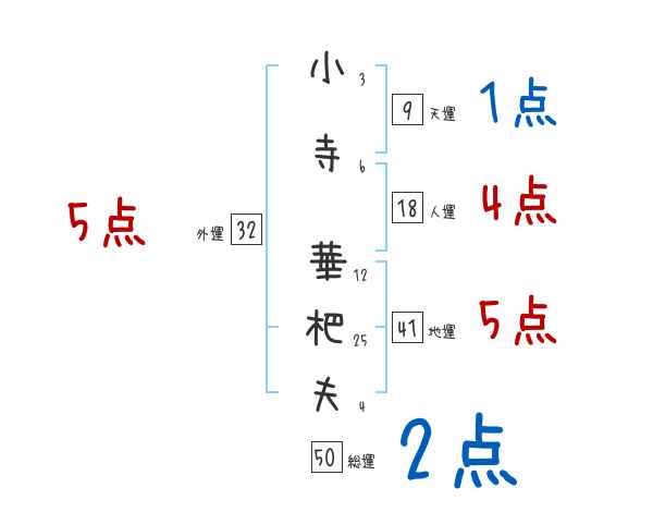 外運![]() | 小寺華杷夫さんの外運は32画の5つ星!柔軟性があり成功する。チャンスが多く金運が良い。 生活面を象徴する運勢です。外部から受ける影響力を表し、結婚運、家庭運や職場、環境への順応性を表します。 |