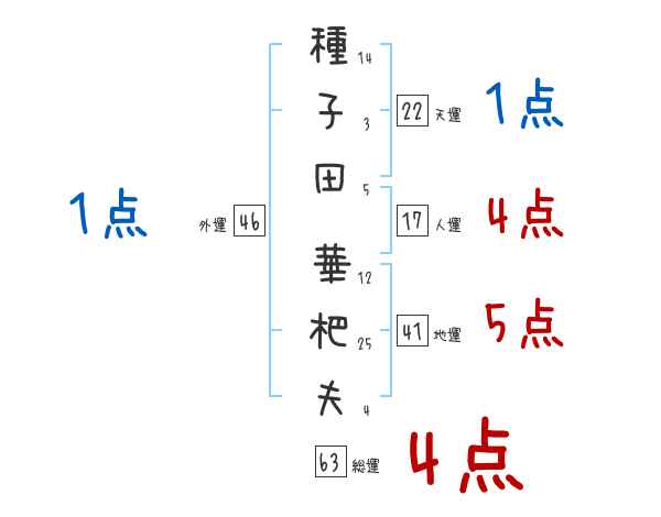 総運![]() | 種子田華杷夫さんの総運は63画の4つ星!家庭運がよく順調な生活。温和な性格。 あなたの人生を表す1番重要な運勢です。生涯を通じて影響する総合運となり、主に50歳以降の晩年期に影響を及ぼします。 |
