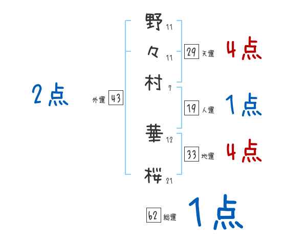 天運![]() | 野々村華桜さんの天運は29画の4つ星!完全主義で才能がある。厳格な心の持ち主。 家系が持つ宿命的な運勢を表します。祖先から受け継いだ苗字ですので自分の力が及びません。家柄を象徴します。 |