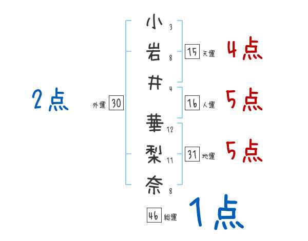 外運![]() | 小岩井華梨奈さんの外運は30画の2つ星!浮き沈みの激しさに注意しましょう。 生活面を象徴する運勢です。外部から受ける影響力を表し、結婚運、家庭運や職場、環境への順応性を表します。 |