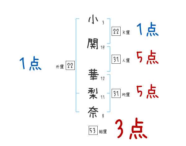 総運![]() | 小関華梨奈さんの総運は53画の3つ星!やや見栄っ張りで虚栄心がある。散財に注意。 あなたの人生を表す1番重要な運勢です。生涯を通じて影響する総合運となり、主に50歳以降の晩年期に影響を及ぼします。 |